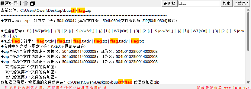 输出后发现压缩包中有一个flag.txt文本文件,但是需要密码才能打开,这里把压缩包丢进随波逐流工具发现是伪加密。