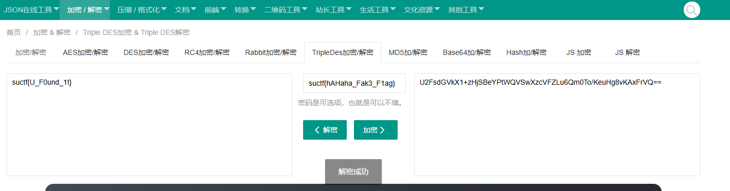 这里我们需要尝试是具体哪种加密方式,最好的做法就是都解密一遍,其中解密过程需要密钥,而密钥就用前面得到的fake flag。最终发现加密方式是3DES,因为这里用上面的密钥进行3DES解密可以得到一个flag,这里解密可以用这个在线工具。