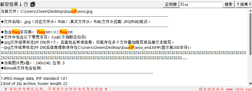 题目已经提示了是明文攻击,就比较简单了,直接下载题目文件,解压缩后有两个文件,一个是带有密码的压缩文件,还有一个jpg格式的图片。把jpg图片放进随波逐流工具,工具显示图片末尾有其它字符。