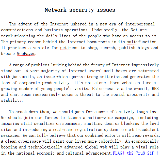 这里把后缀改为doc后重新打开文件。搜索后发现flag在结尾但是文字颜色是白色所以刚进去看不到,调整颜色后得到flag。