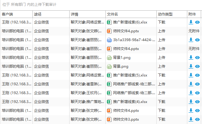 软件可详细记录员工通过网络进行的文件上传与下载行为,包括文件名、大小、途径、传输时间等关键信息。