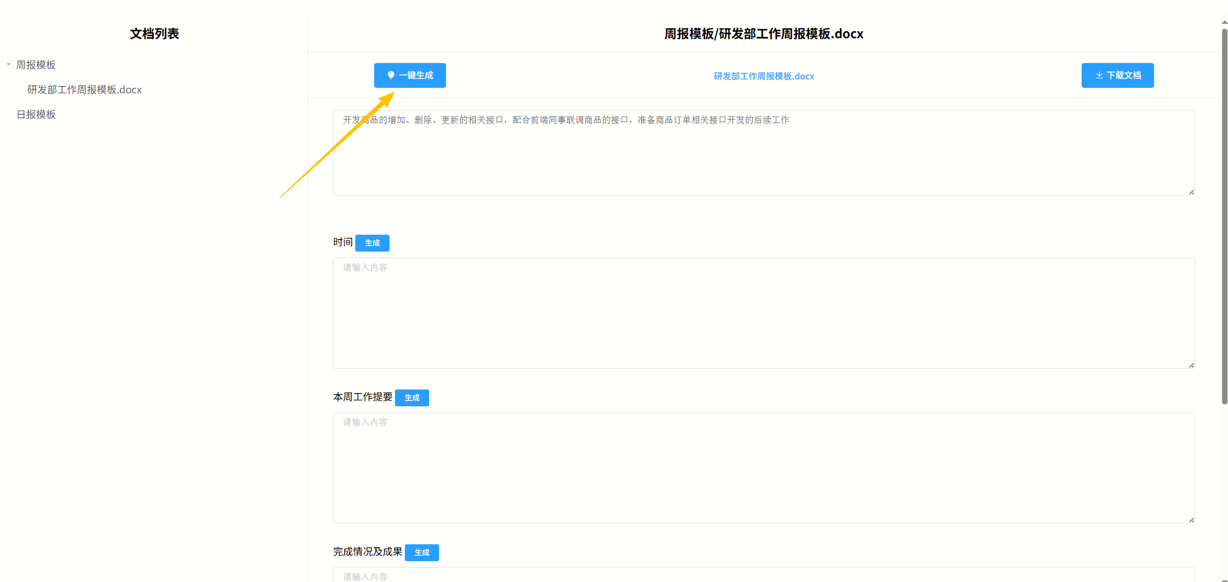 ① 我们就试用作者提供的模板进行试用,先在描述中编写本周工作简述,然后点击界面中的“一键生成”。