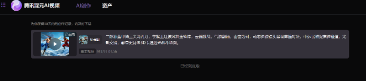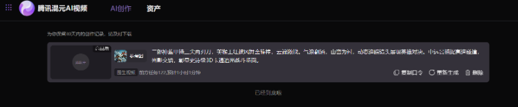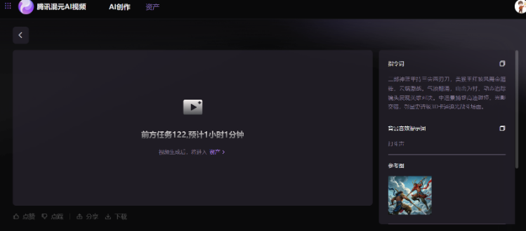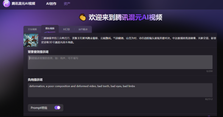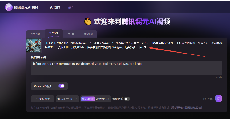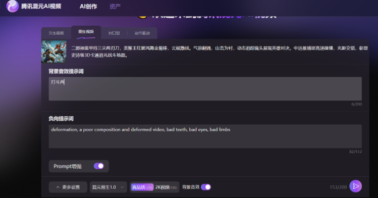 3D卡通追光风格的史诗级战斗场面。“二郎神大战美猴王”的经典对决在云霄之上展开。二郎神身着蓝色战甲,手持寒光闪烁的三尖两刃刀,姿态威武,眼神坚定;美猴王则一身火红披风,挥舞着熠熠生辉的如意金箍棒,身姿矫健,斗志昂扬。两人在蓝天白云与雄伟山脉的背景下激烈交锋,动作迅猛,每一次碰撞都激起阵阵气浪。环绕镜头捕捉每一个紧张刺激的瞬间,展现出双方不屈不挠的战斗精神。中远景,动态追踪镜头,凸显英雄气概。当然,为了后续对比,我们还是希望仍然运行该提示词以保持一致。但是我们注意到混元AI视频平台对提示词内容输入框的字数限制是200字符,原提示词超长被自动截断。