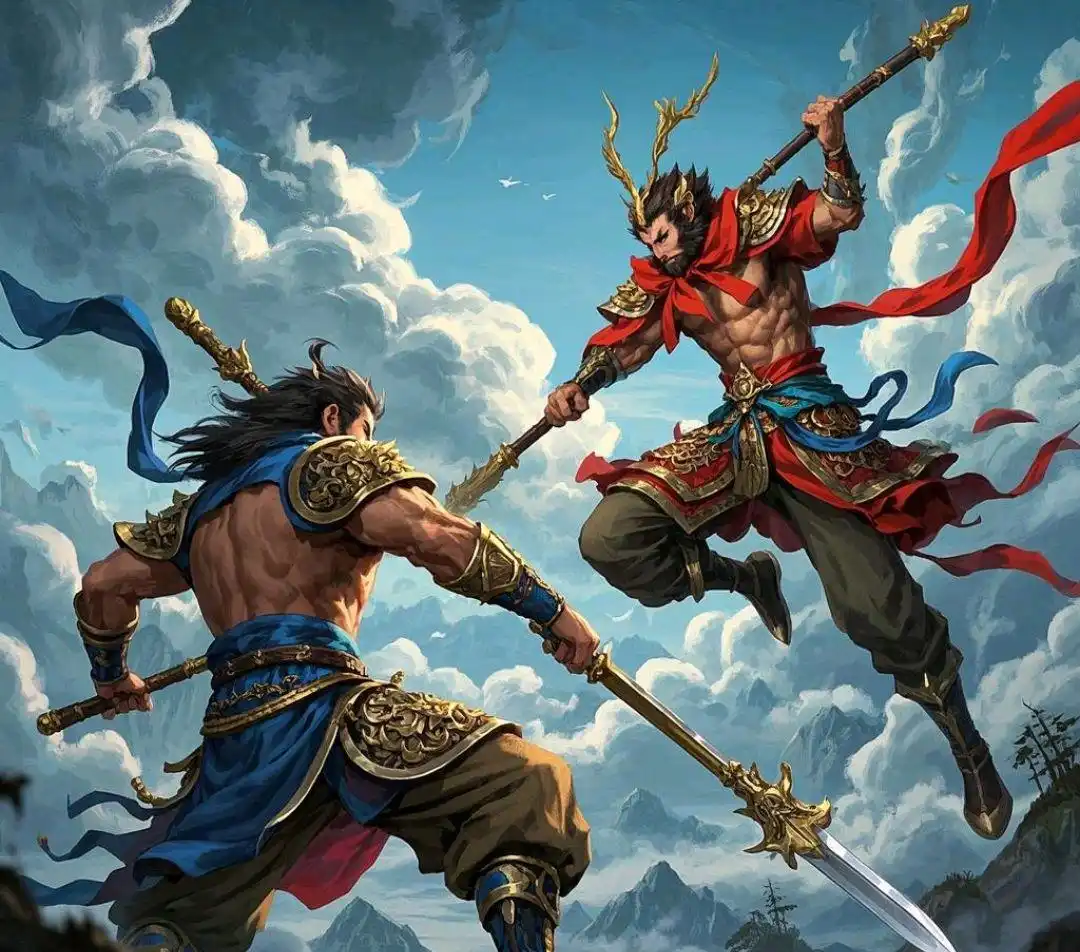 二郎神蓝甲持三尖两刃刀,美猴王红披风舞金箍棒,云端激战。气浪翻涌,山峦为衬,动态追踪镜头展现英雄对决。中远景捕捉高速碰撞,光影交错,彰显史诗级3D卡通追光战斗场面。嗯,就这样吧,提示词准备完毕。