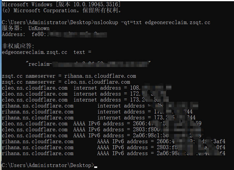 nslookup -qt=txt edgeonereclaim.zsqt.cc 这个域名改成自己的