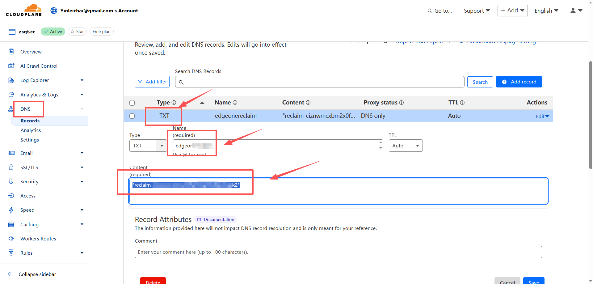 这里举一个例子,我使用的事cloudflare管理的我的域名 zsqt.cc,相关的DNS解析如下: