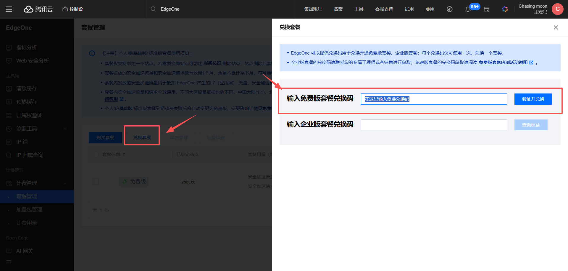 在EdgeOne控制台点击“添加站点”,输入你的域名(如zsqt.cc
