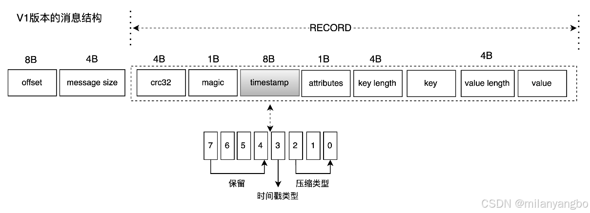 1)relativeOffset(4B):消息的相对偏移量,即offset - baseOffset,其中baseOffset为整个segmentLogFile的起始消息的offset。