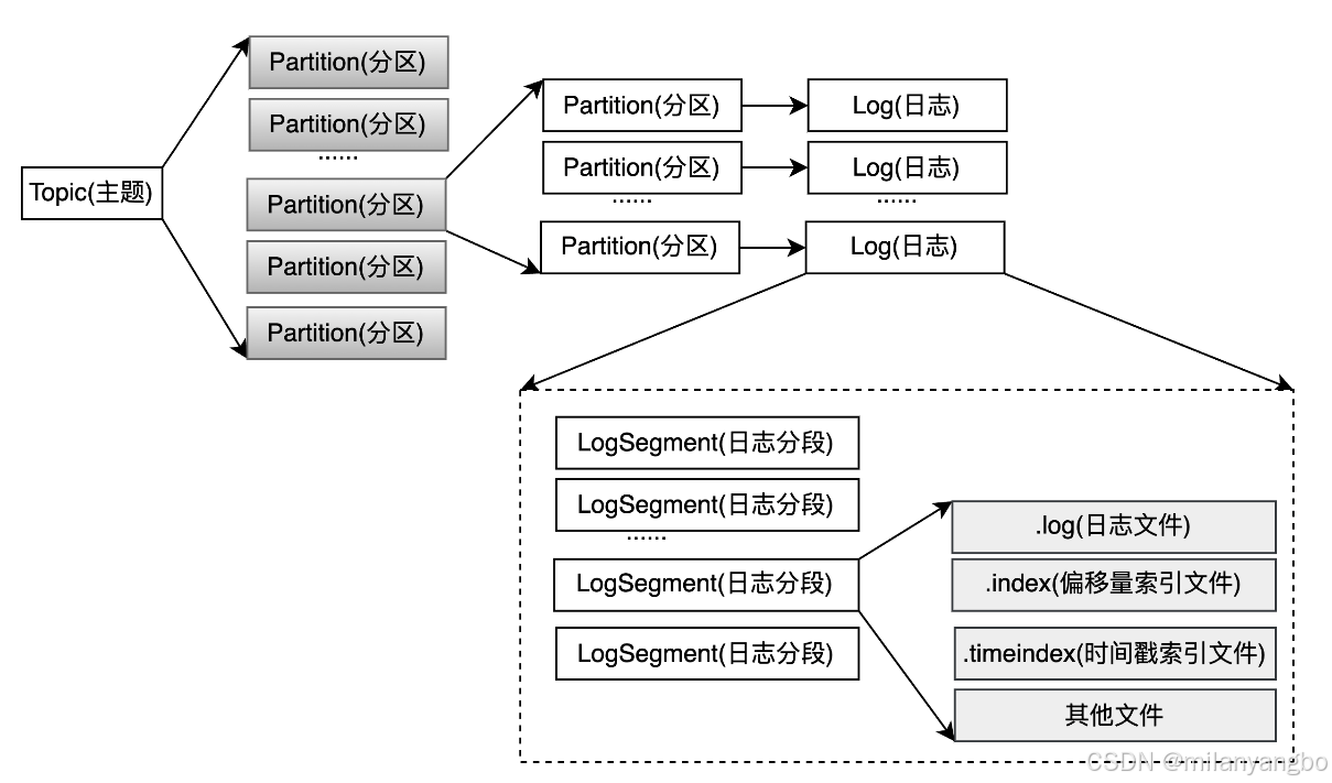 Log 和 LogSegement 也不是纯粹物理意义上的概念,Log 在物理上只是以文件夹的形式存储,而每个 LogSegement 对应于磁盘上的一个日志文件(.log)和两个索引文件(.index、timeindex),以及可能的其他文件(比如以.txindex为后缀的事务索引文件)。