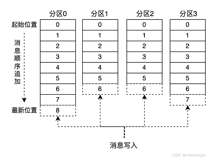 4)偏移量:消息在日志中的位置,消息在被追加到分区日志文件的时候都会分配一个特定的偏移量。偏移量是消息在分区中的唯一标识,是一个单调递增且不变的值。Kafka 通过它来保证消息在分区内的顺序性,不过偏移量并不跨越分区,也就是说,Kafka 保证的是分区有序而不是主题有序。