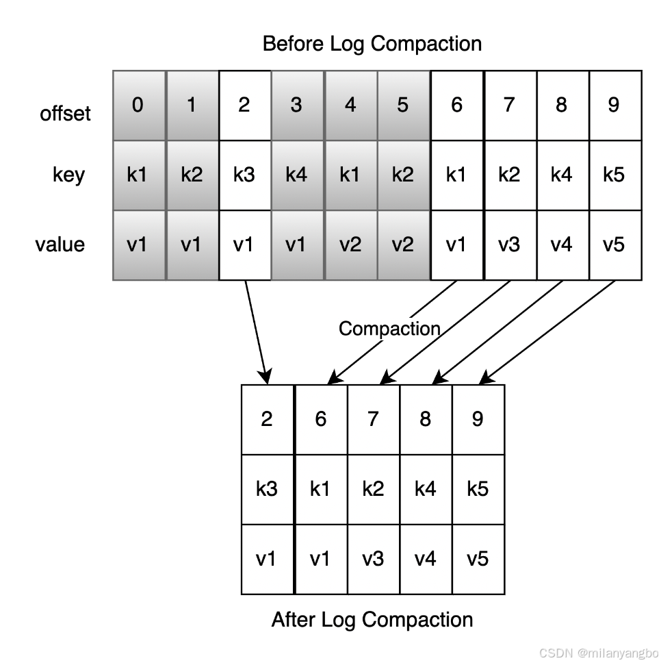 2)日志合并(Log Compaction):针对每个消息的key进行整合,对于有相同key的的不同value值,只保留最后一个版本。