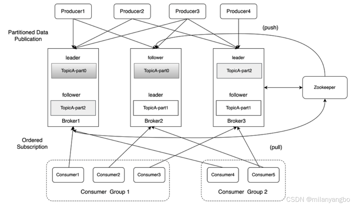 2)分区:硬盘实际根据分区存储日志。一个主题下通常有多个分区,分区分布在不同的broker上,这使Kafka提供给了并行的消息处理和横向扩容能力。并且分区通常会分组,每组有一个主分区、多个副本分区,并分布在不同的broker上,从而起到容灾的作用。