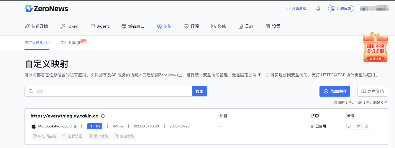 进入 ZeroNews 平台→添加域名端口→添加映射→选择映射类型开始创建即可。