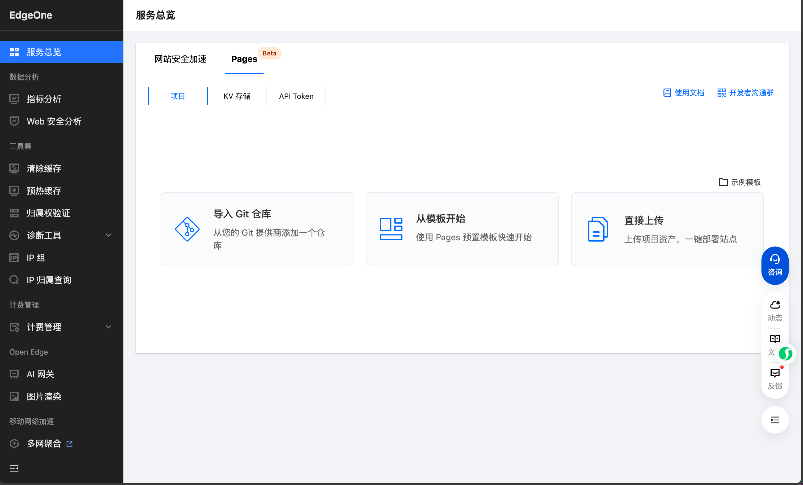 简单来说,EdgeOne Pages就是腾讯云EdgeOne平台提供的一个静态网站托管服务。它能让你把前端项目(比如React、Vue、Next.js、Nuxt.js等构建的静态站点)直接部署到腾讯云的边缘节点上,享受全球加速和安全防护。是不是听起来就有点Vercel那味儿了?