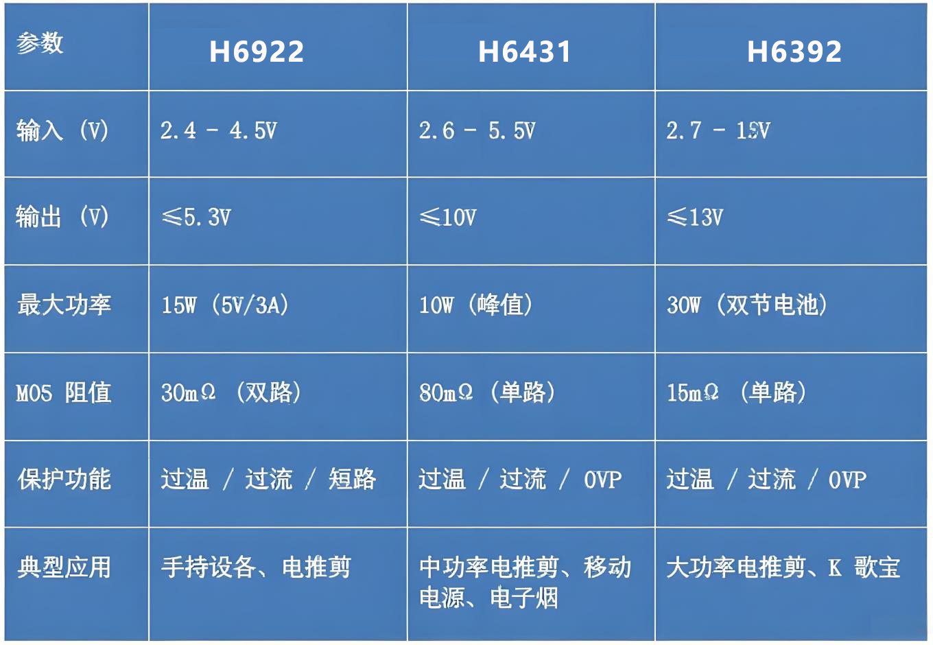 阻值越低导通损耗越小,H6392 的 15mΩ MOSFET 适合大功率场景。