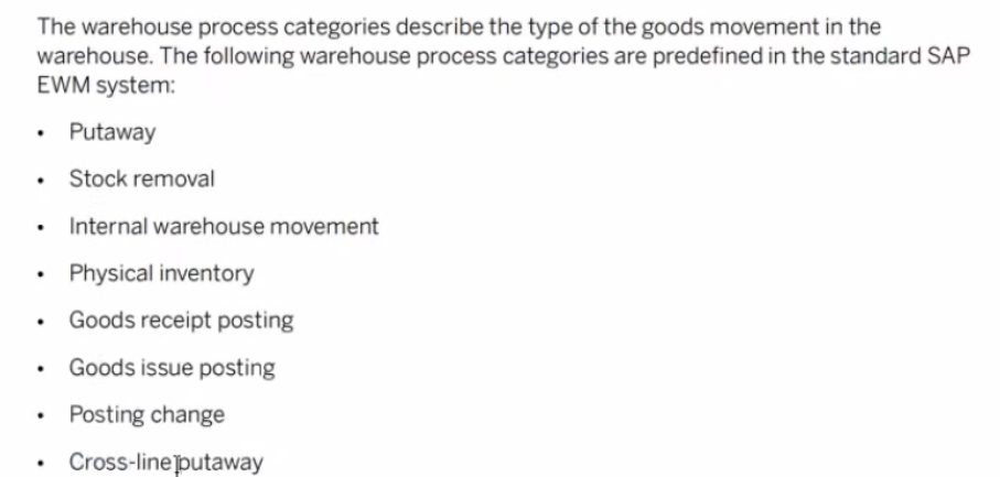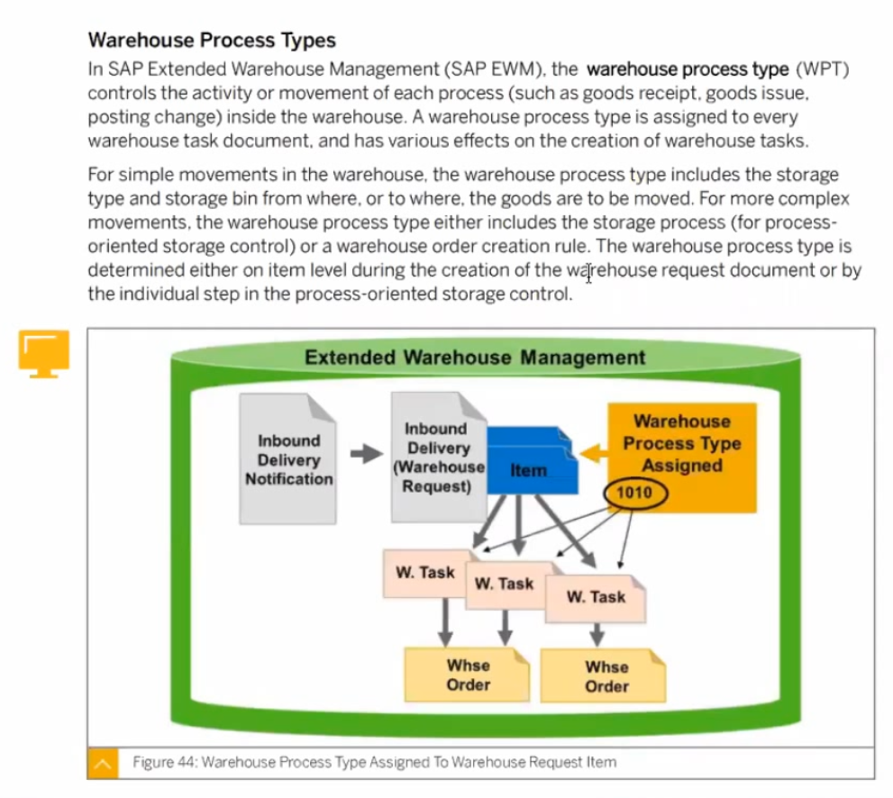 For example, when an inbound delivery is created, the system assigns a WPT (e.g., 1010 for putaway), which defines the source storage type, storage bin, and goods movement bin.
