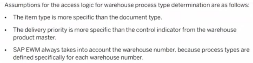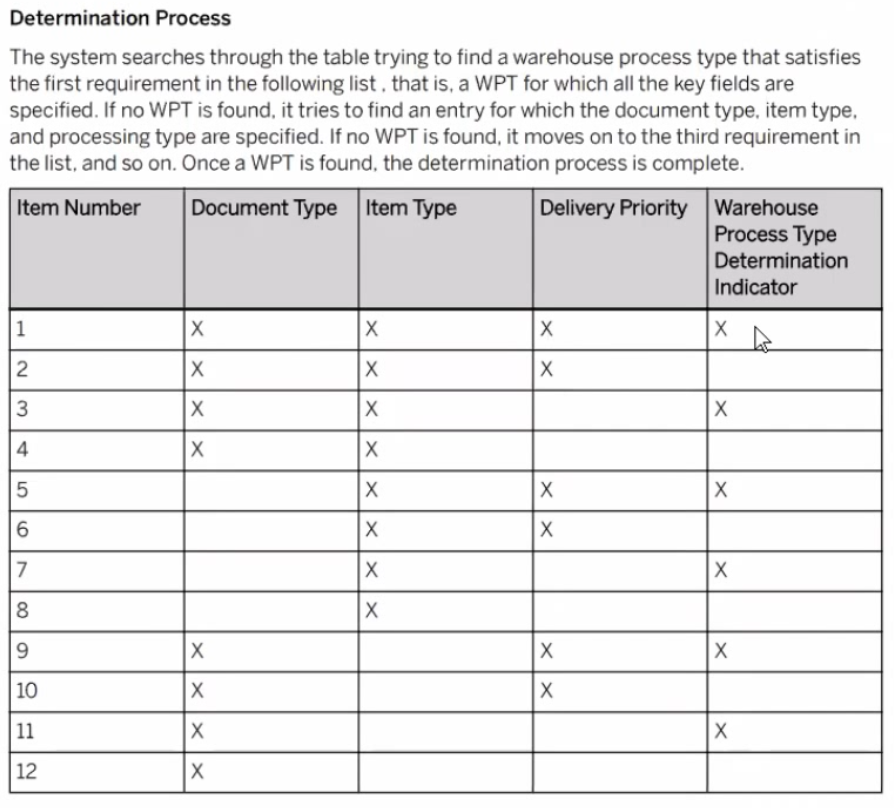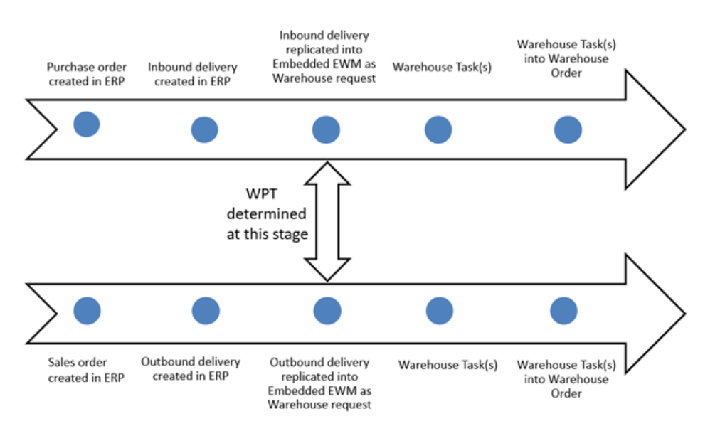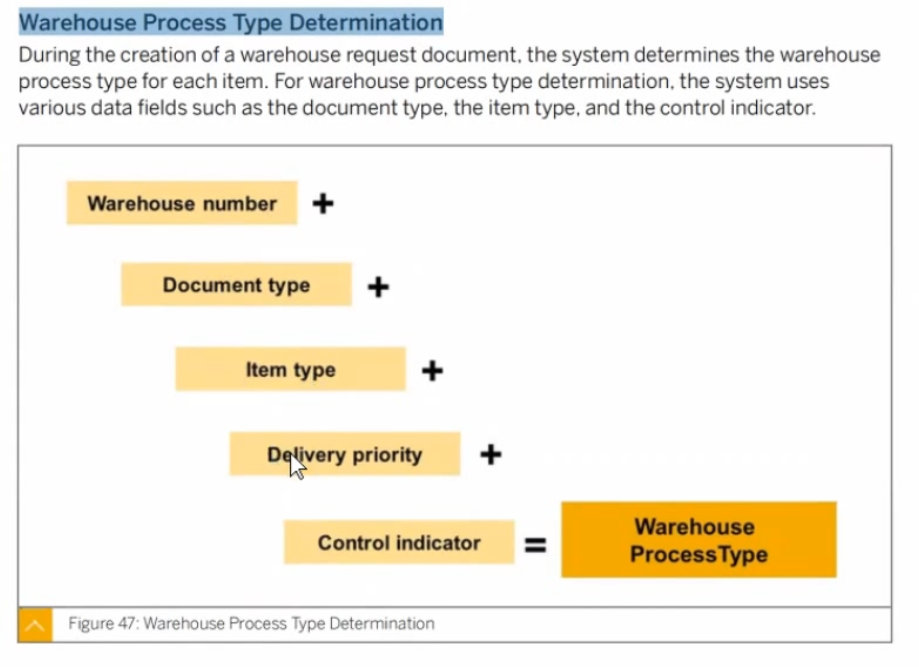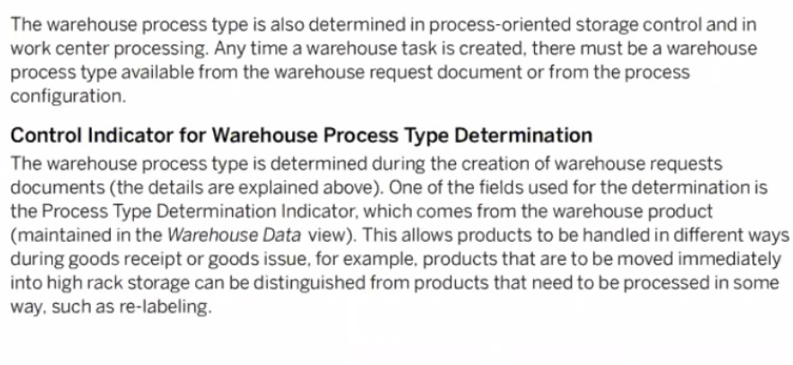 The Warehouse Process Type (WPT) gets determined during the creation of warehouse requests (Inbound delivery or the Outbound delivery) and it has its own control settings. For example, from or to Storage type / storage bin information for regular good movements or a Storage control in case of Process or Layout storage control process is required or Warehouse Order creation rule for grouping the warehouse tasks. Subsequently, the warehouse process type gets carried over to the warehouse task.