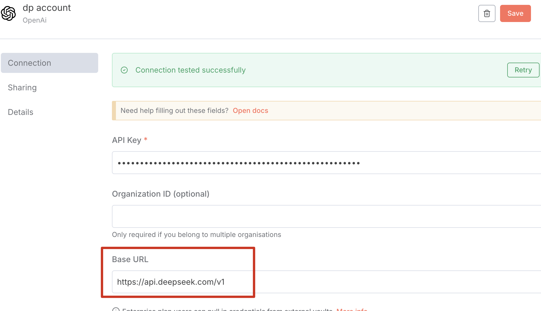 我选用的模型是 DeepSeek,价格便宜且好用。它的 API 兼容 OpenAI 格式,所以可以直接用 OpenAI 模型节点。