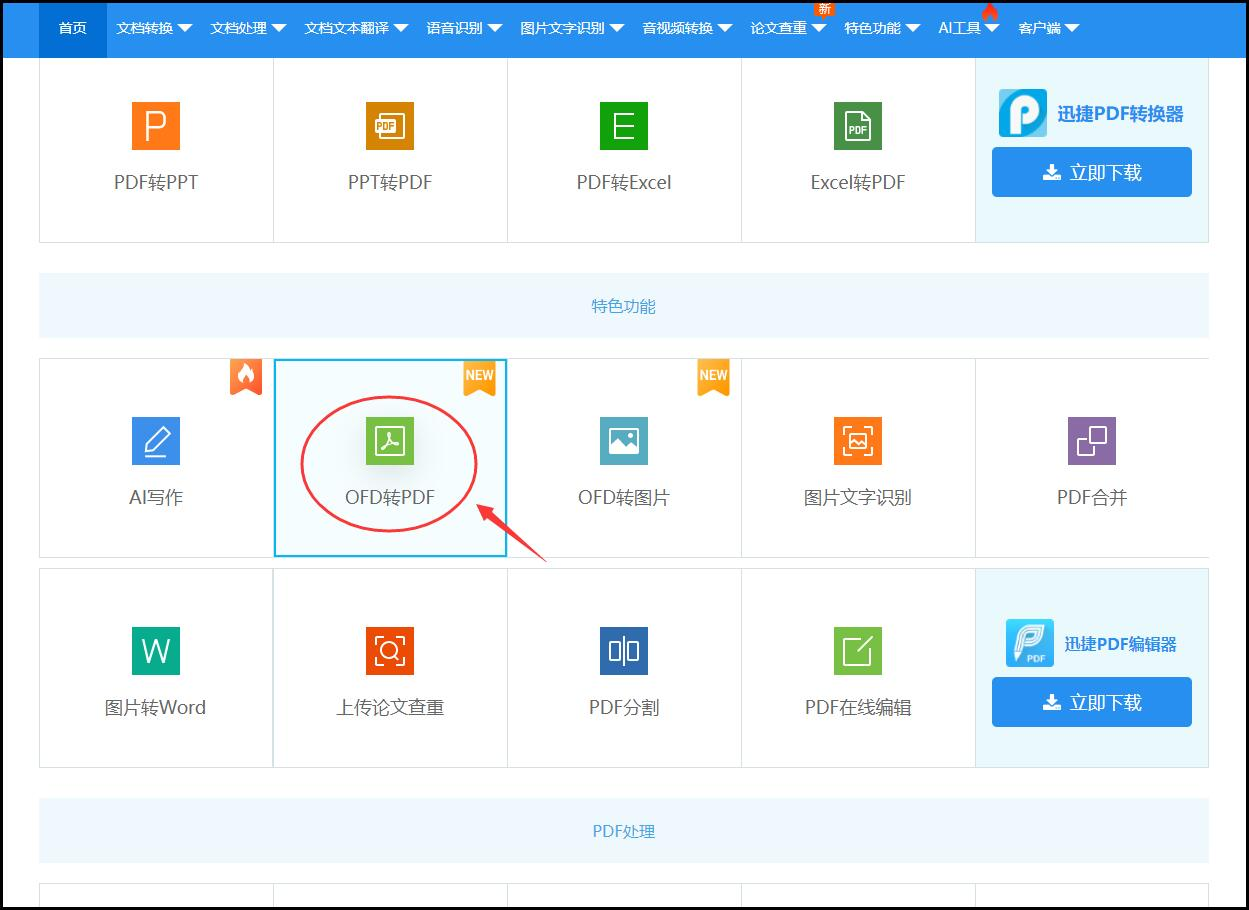 1、在浏览器中搜索进入该在线工具,在首页中点击选择“OFD转PDF”功能,然后将需要转换的ofd文件导入进来。