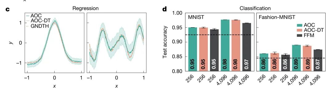 - 实验验证显示,在SNR=10-15dB(模拟硬件典型噪声水平)下,AOC对MNIST分类的准确率下降不足1%,而同等噪声下深度前馈网络准确率下降超5%;回归任务中,通过11次重复运行平均,可将高斯曲线拟合的MSE从3.75×10⁻³进一步降低至2×10⁻³,且曲线平滑度显著提升。