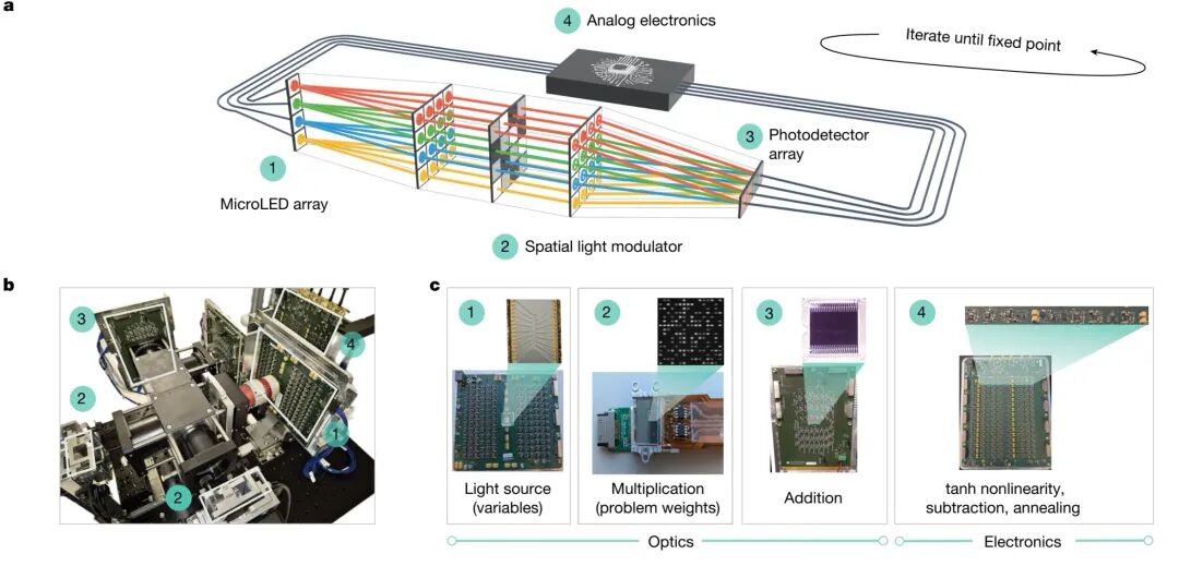 在硬件映射中,该迭代通过“光学矩阵-向量乘法+模拟电子非线性/控制”循环实现,单次迭代耗时约20ns,多次迭代后收敛至定点(信号幅度稳定),最终仅需一次数字读取,最大化模拟计算占比。