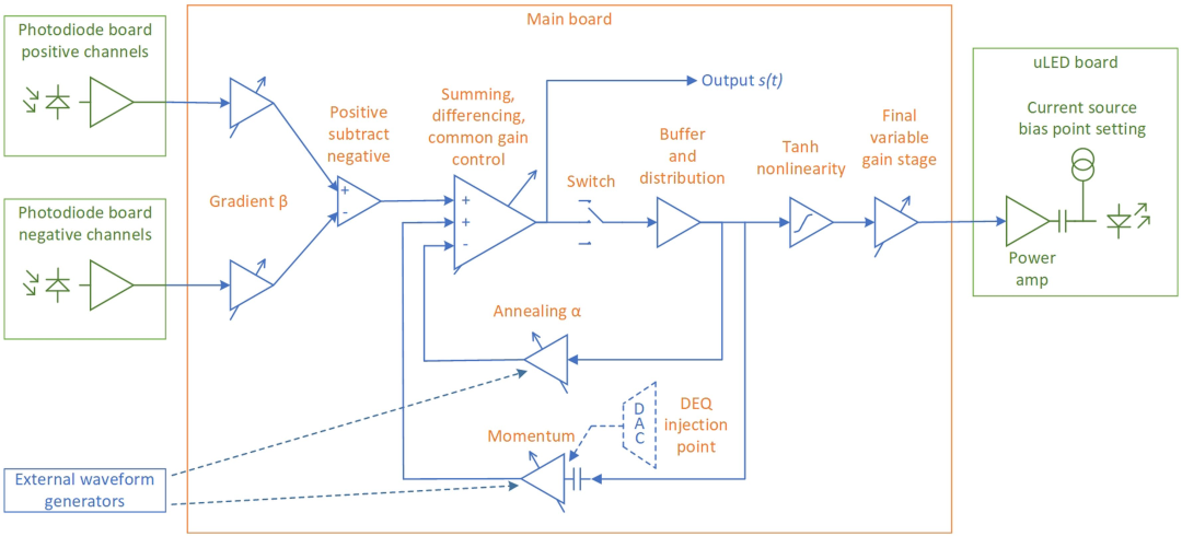 模拟电子子系统负责实现定点迭代中的非线性、退火、动量等功能,核心电路包括可变增益放大器(VGA)、差分放大器、tanh非线性模块、开关与缓冲器,采用商用SMT元件(规模化后计划替换为模拟ASIC以缩小体积、降低功耗)。