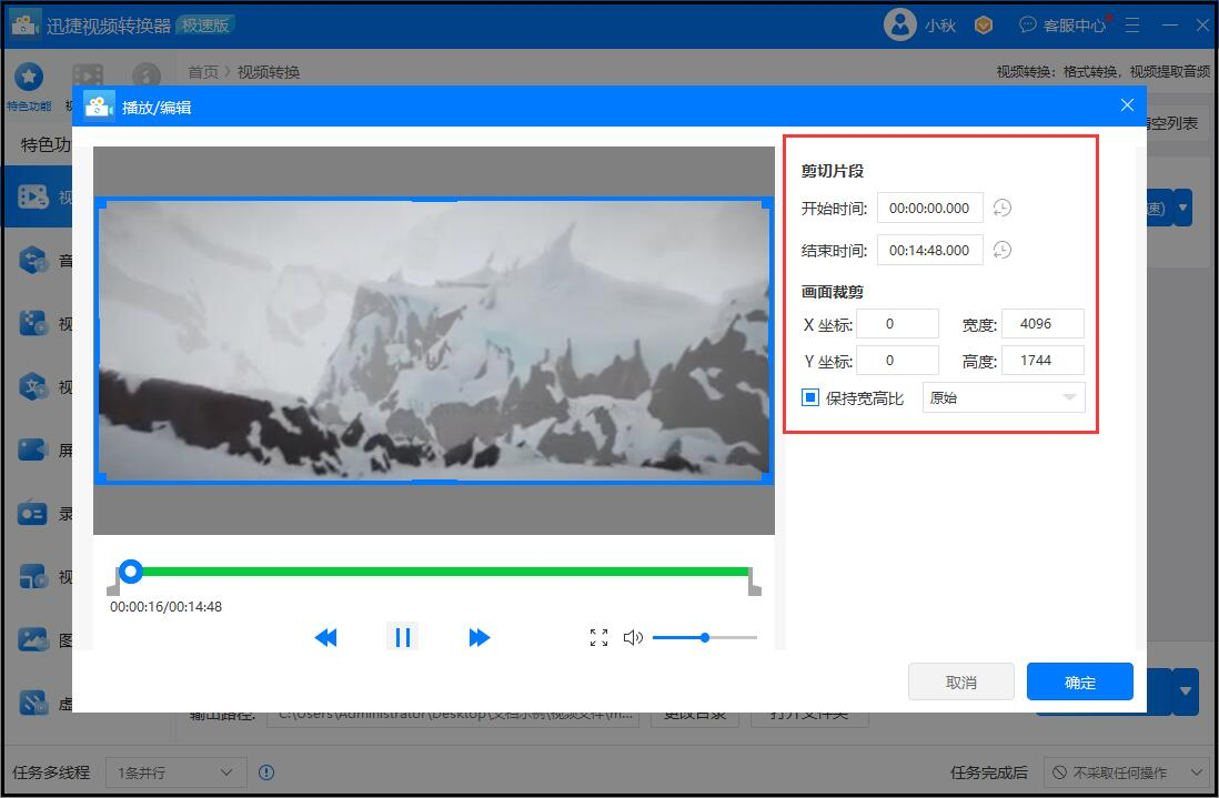 4、在输出为MP4格式前,还可以点击识别出来的视频右侧“播放/编辑”,就会弹出一个预览窗口,可以对视频进行剪切、画面裁剪、宽高比设置等,如果没有这个需求的话,直接转换格式就可以了。