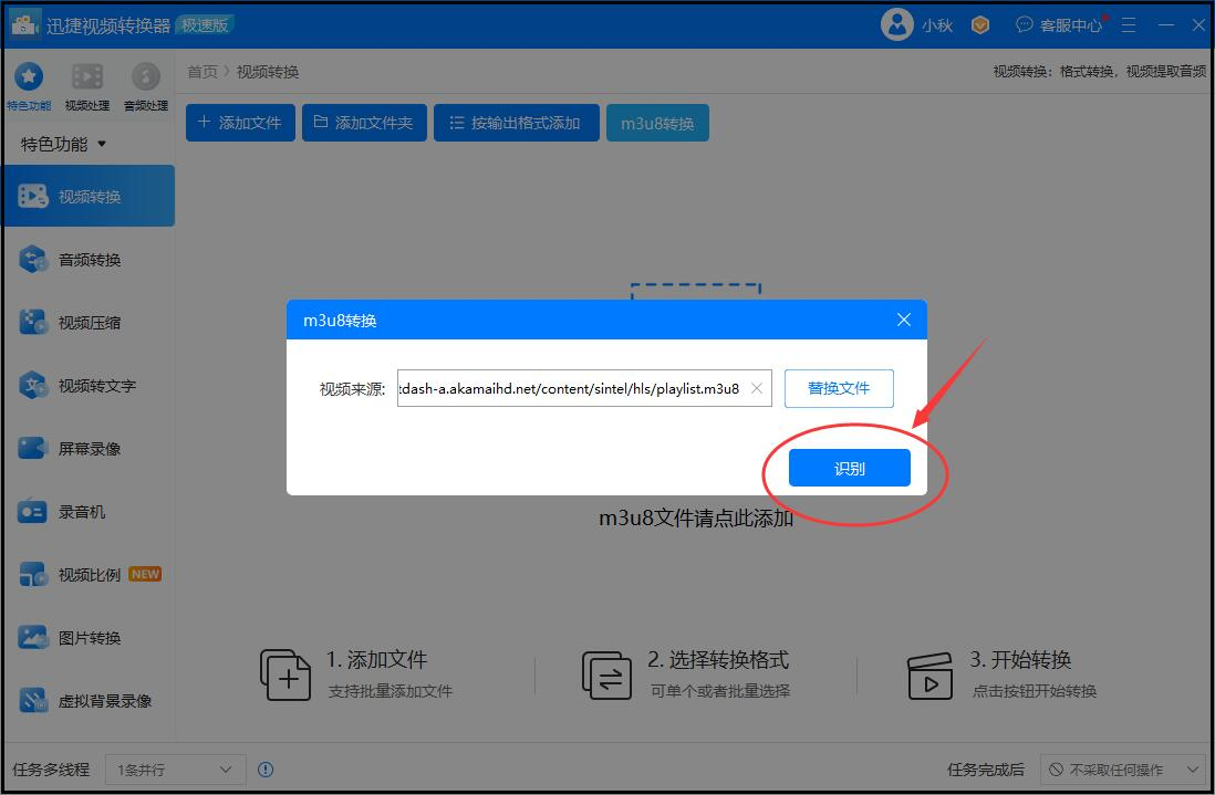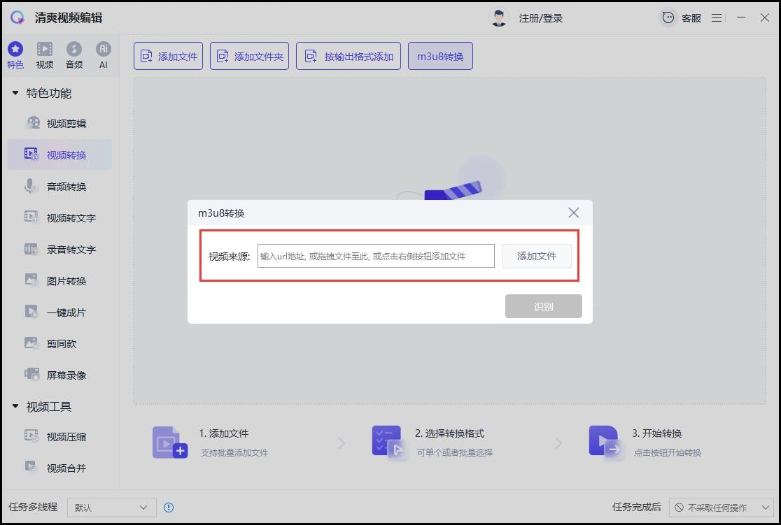 这也是一款专业的音视频编辑工具,主打“简洁操作、零学习成本、快速出片”,适合新手用户、短视频创作者及日常剪辑需求者。通过它也可以将m3u8转换成MP4格式,只需点击“视频转换”,选择m3u8文件添加,将链接复制进去,点击识别后,等待复制完成后选择MP4格式进行转换就可以啦。