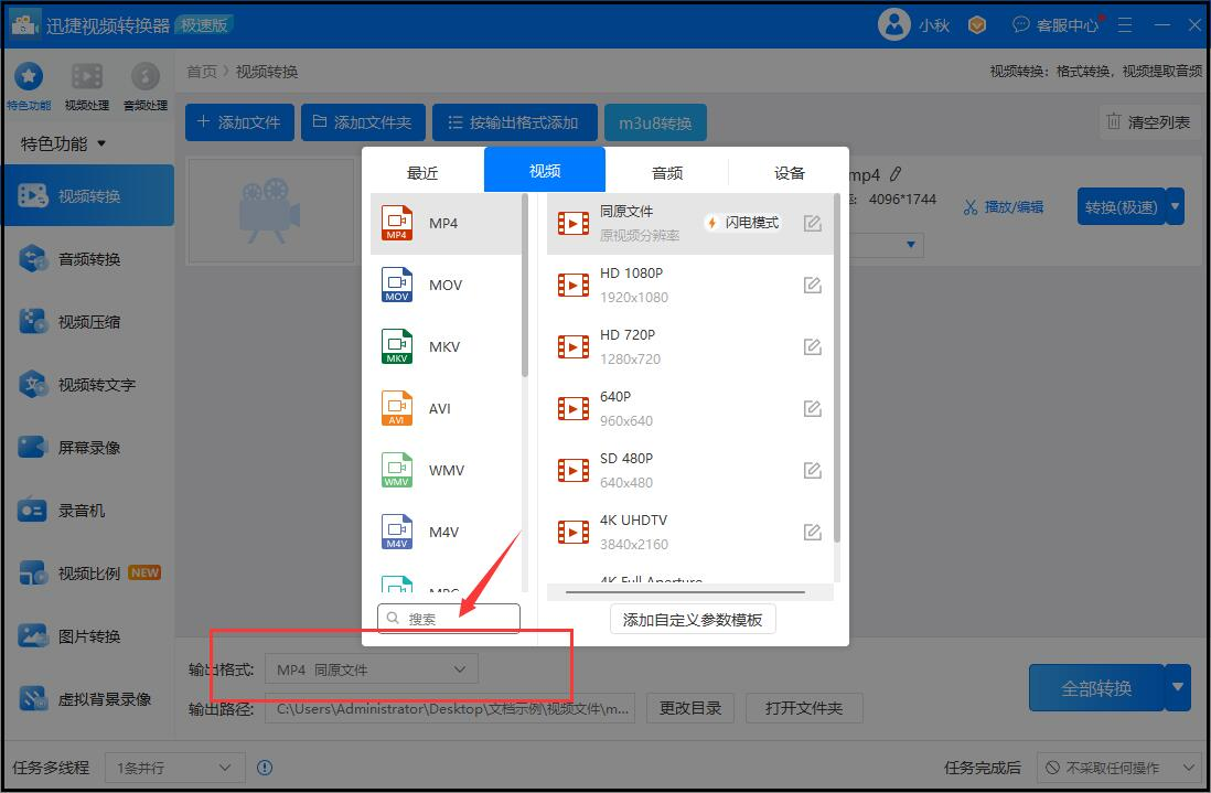 3、很快,软件就会将m3u8视频给识别出来,点击界面下放的“输出格式”,可以在输出格式选项中,选择需要的MP4格式,以及视频的品质大小,最后点击右下角的“全部转换”,就可以完成m3u8转MP4啦。