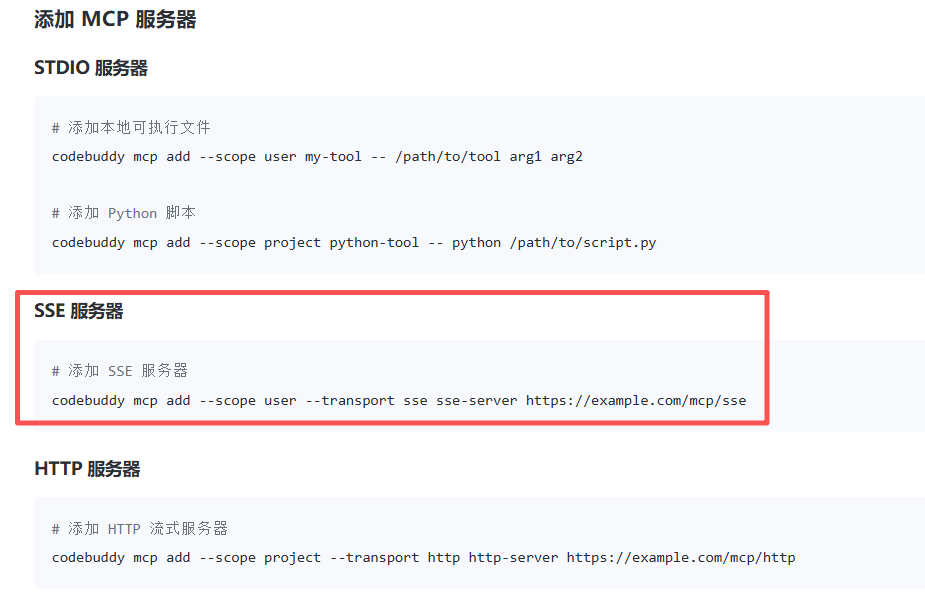 正如前面提到的,Lighthouse MCP 服务提供的是一个 SSE 端点。Codebuddy CLI 通过其文档明确支持以 SSE 作为传输方式来添加 MCP。这种机制非常适合于 AI 助手接收来自外部工具的流式响应和状态更新。