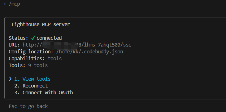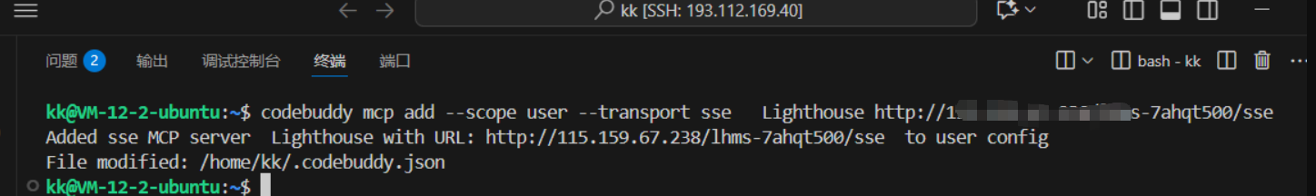 我们在 Codebuddy CLI 中执行 mcp add 命令,将之前获取到的 Lighthouse MCP 连接地址添加进去。