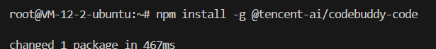 万事俱备,现在我们可以使用 npm 来全局安装 Codebuddy CLI。-g 标志表示将该软件包安装在系统范围内,使其 codebuddy 命令可以在任何路径下被调用。