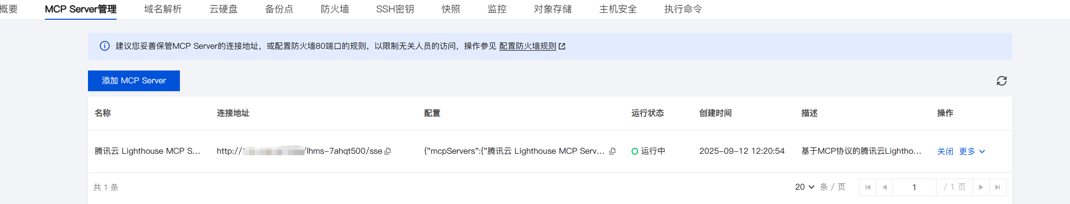 “MCP Server 1.0.0” 镜像预装并配置了与 Lighthouse 服务进行 MCP 通信所需的基础环境和代理服务。使用该镜像的优势是显而易见的: