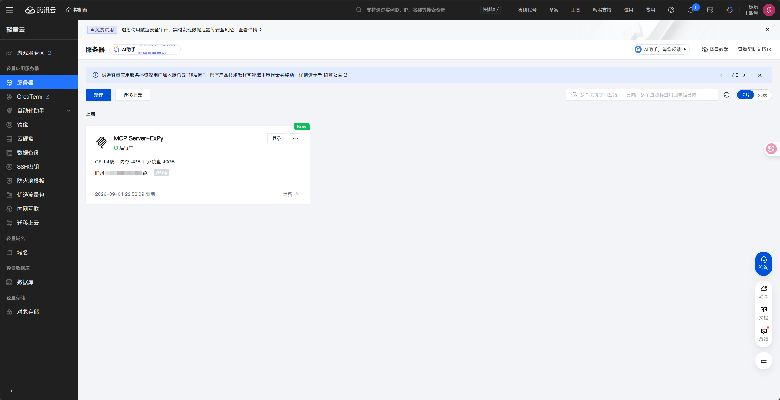 服务器实例创建成功后,我们便进入了整个流程中最关键的一环:激活并配置 MCP 服务,建立 Codebuddy AI 与 Lighthouse 服务器之间的通信链路。