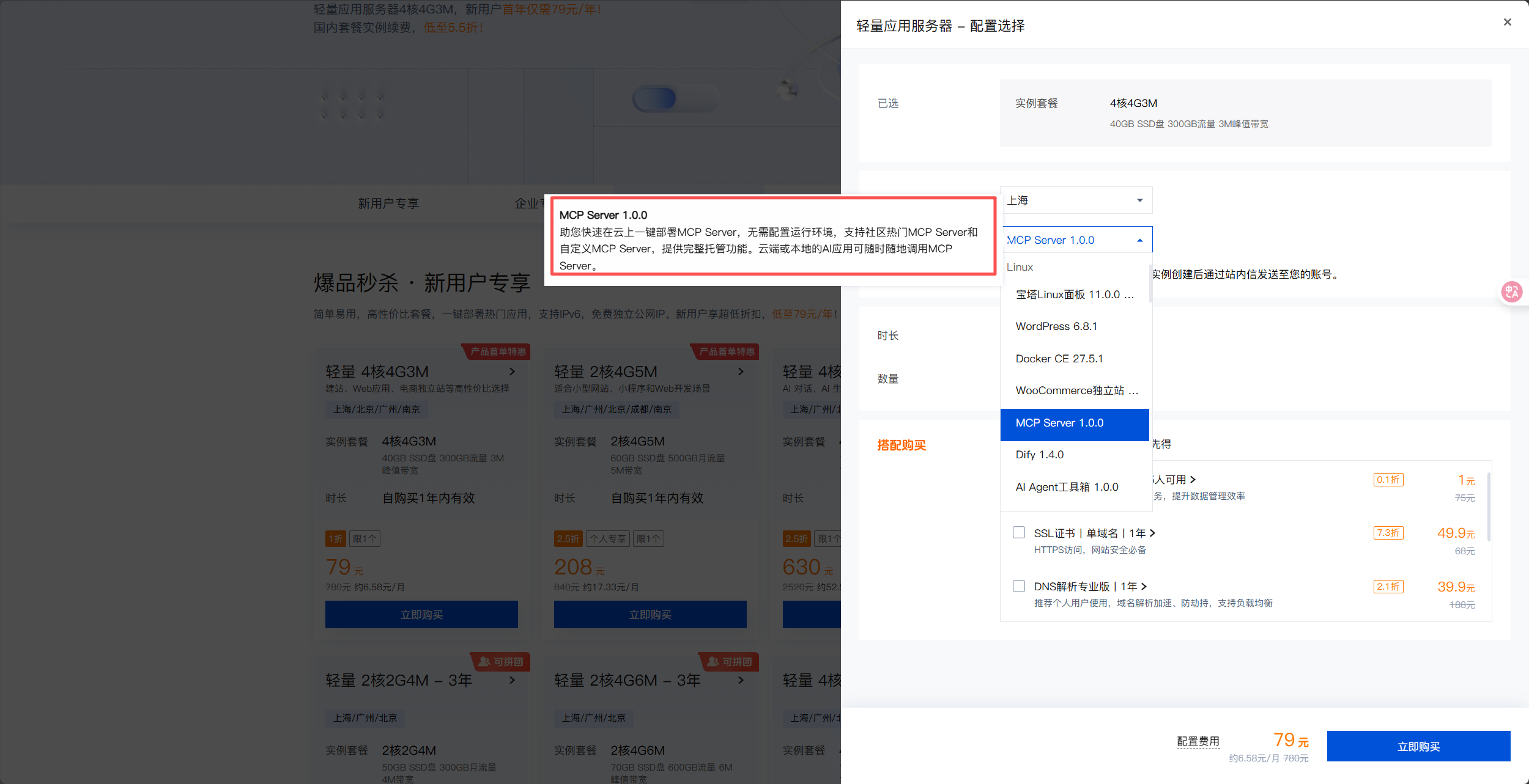 在操作系统层面,我们选择了一个具有特定目的的镜像:MCP Server 1.0.0。这并非一个常规的通用操作系统镜像(如 Ubuntu 或 CentOS)。选择此镜像的背后,是前瞻性的架构考量。MCP,即模型上下文协议(Model Context Protocol),是实现 AI 模型与外部工具(如云服务 API)进行交互的核心。