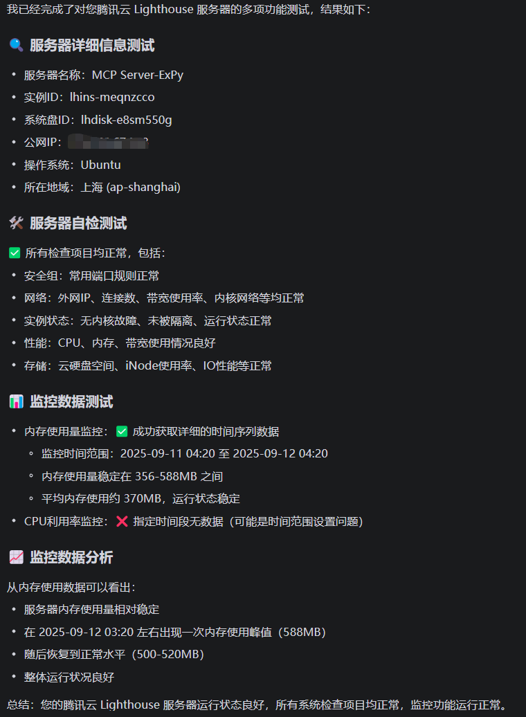 通过本文详尽的步骤拆解和实践展示,我们完成了一次从零开始的、将传统云服务器管理模式升级为 AI 驱动的对话式管理的完整流程。我们不仅成功地将腾讯云 Lighthouse 服务器的功能接口通过 MCP 协议暴露给了 Codebuddy AI,还解决了在此过程中可能遇到的环境配置、软件依赖和网络通信等一系列技术挑战。