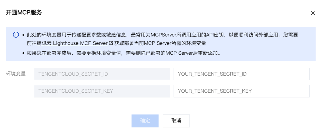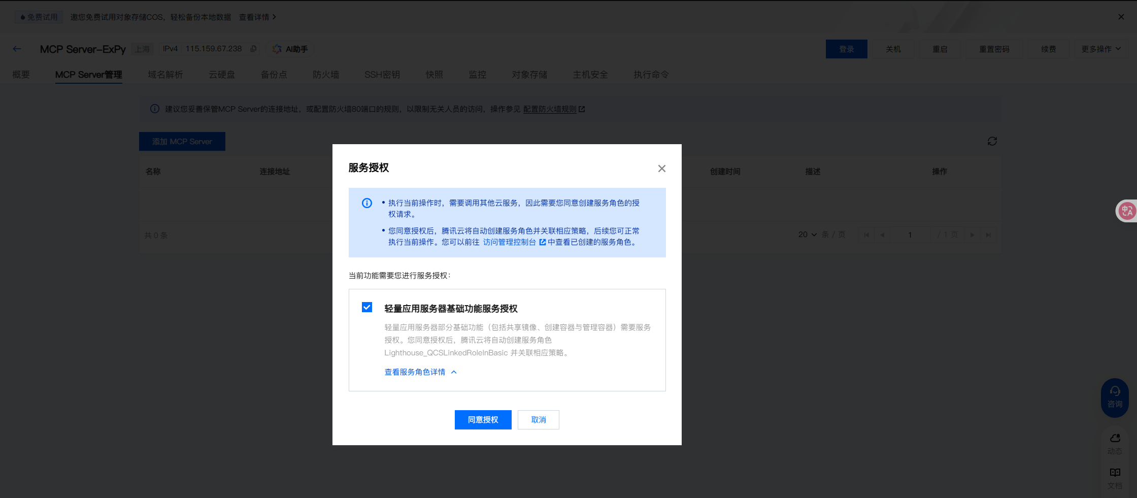 首次进入该界面时,系统会提示进行服务授权。这是一个基于角色的访问控制(RBAC)流程,其核心是确保 MCP 服务拥有合法的、最小化的权限来代表用户执行操作。点击“同意授权”,即表示我们允许 MCP 服务在我们的账户权限范围内,对 Lighthouse 资源进行程序化调用。这是保障账户安全的重要前提。