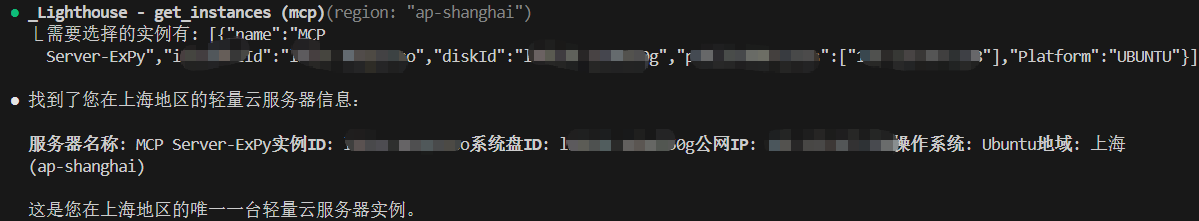 调用mcp将我在上海的轻量云服务器的信息进行输出。