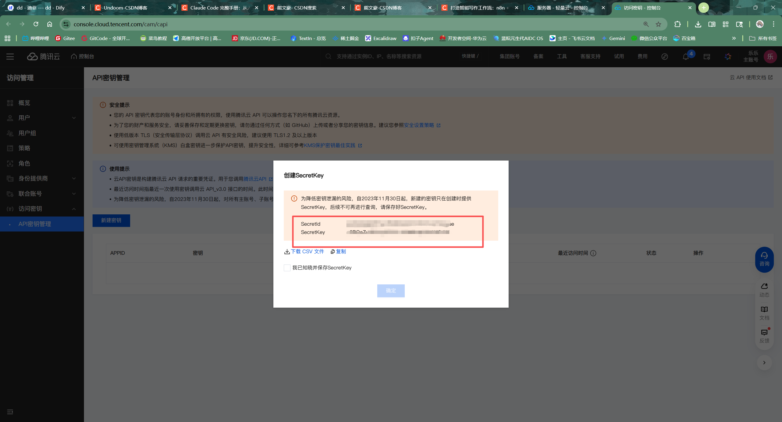 这对密钥是腾讯云访问管理(CAM)系统中的核心概念,它们是用于程序化访问腾讯云 API 的永久凭证,其作用等同于账户的用户名和密码。我们必须前往 腾讯云 CAM 控制台 进行创建和管理。
