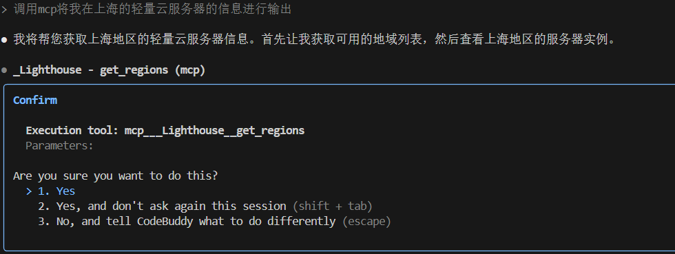 现在,我们可以直接在 Codebuddy CLI 中使用自然语言下达指令。例如,我们想要查询位于上海地域的服务器信息: