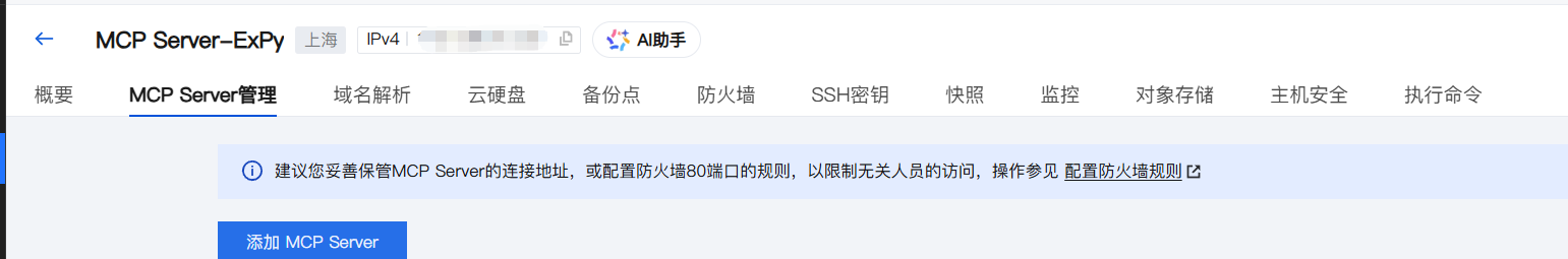 在服务器的详情页面中,我们找到并点击顶部导航栏的 MCP Server 管理 选项。这是一个专门为管理和配置 MCP 服务而设的入口。
