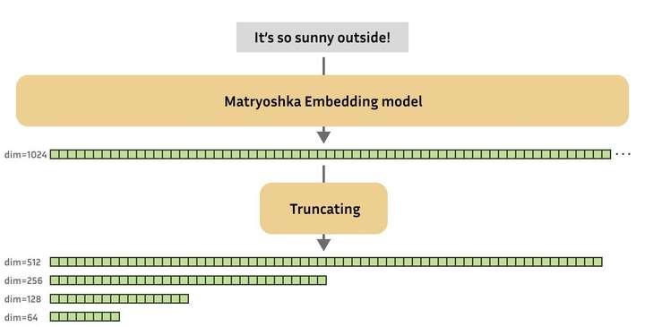 Matryoshka Embedding 允许模型在训练过程中构建一种嵌套结构的向量表示,例如前64维已经包含向量80%的信息。使用时可根据需要截取不同维度(如64、128、256维),实现精度与效率的动态平衡。