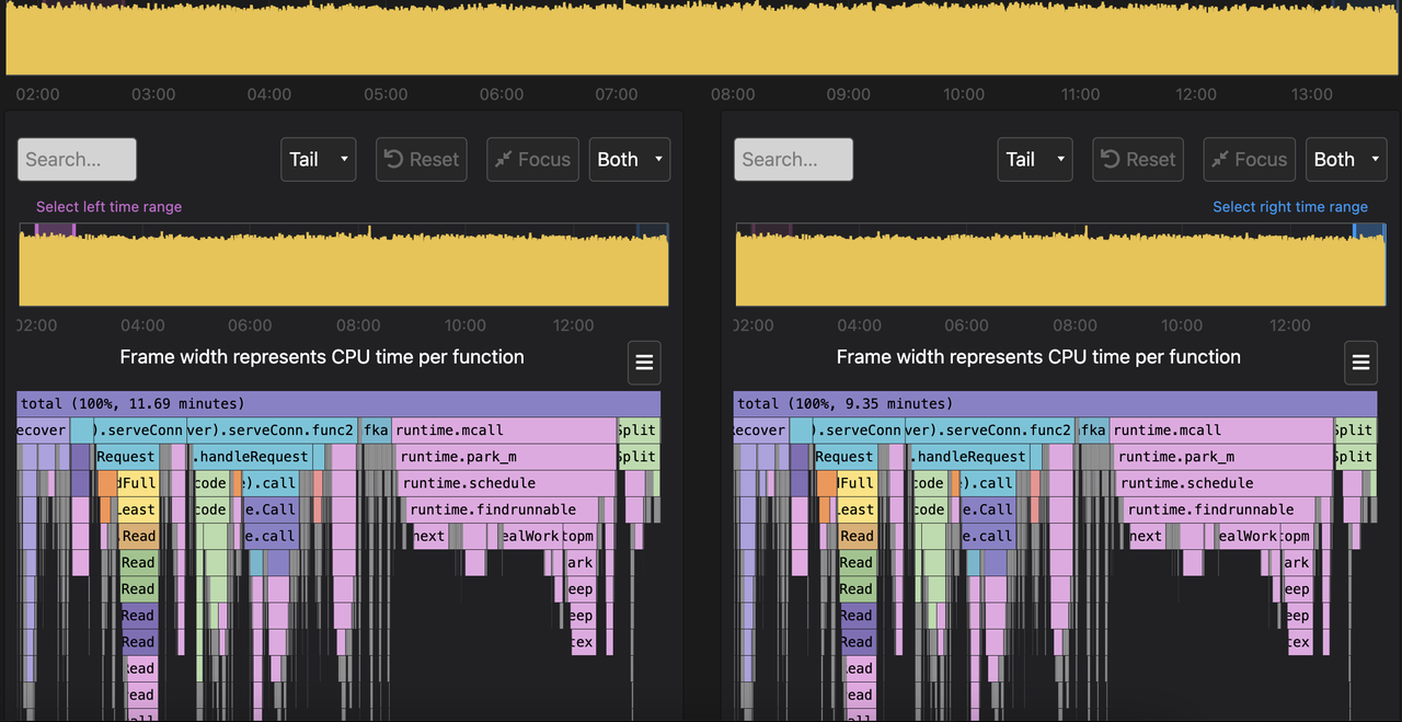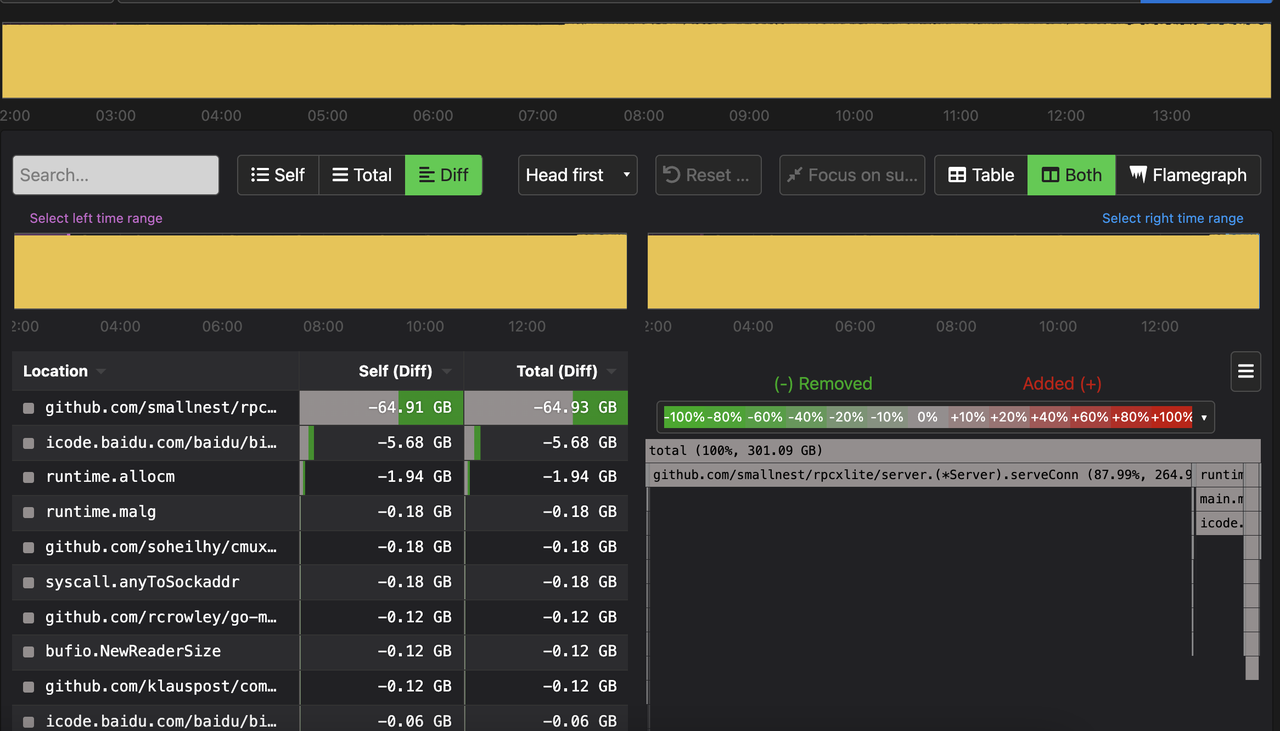 另外我们可能需要不同时段的profile进行对比,进行比较才能发现问题,比如内存泄露的问题。