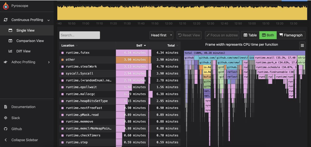 Pyroscope是一个开源的持续分析系统,使用Go语言实现。服务端使用web页面查看,提供丰富的分析的功能,客户端提供Go、Java、Python、Ruby、PHP、.NET等多种语言的支持,并且支持PUSH、PULL两种采集方式。