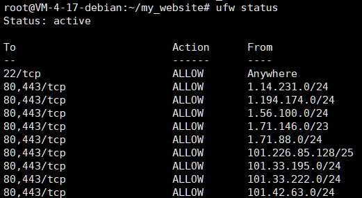 ufw status2.如果出现一个长长的 ALLOW列表,来源全都是 EdgeOne 的官方 IP 地址段,类似下图,那么“隐藏源站 IP”已实现。