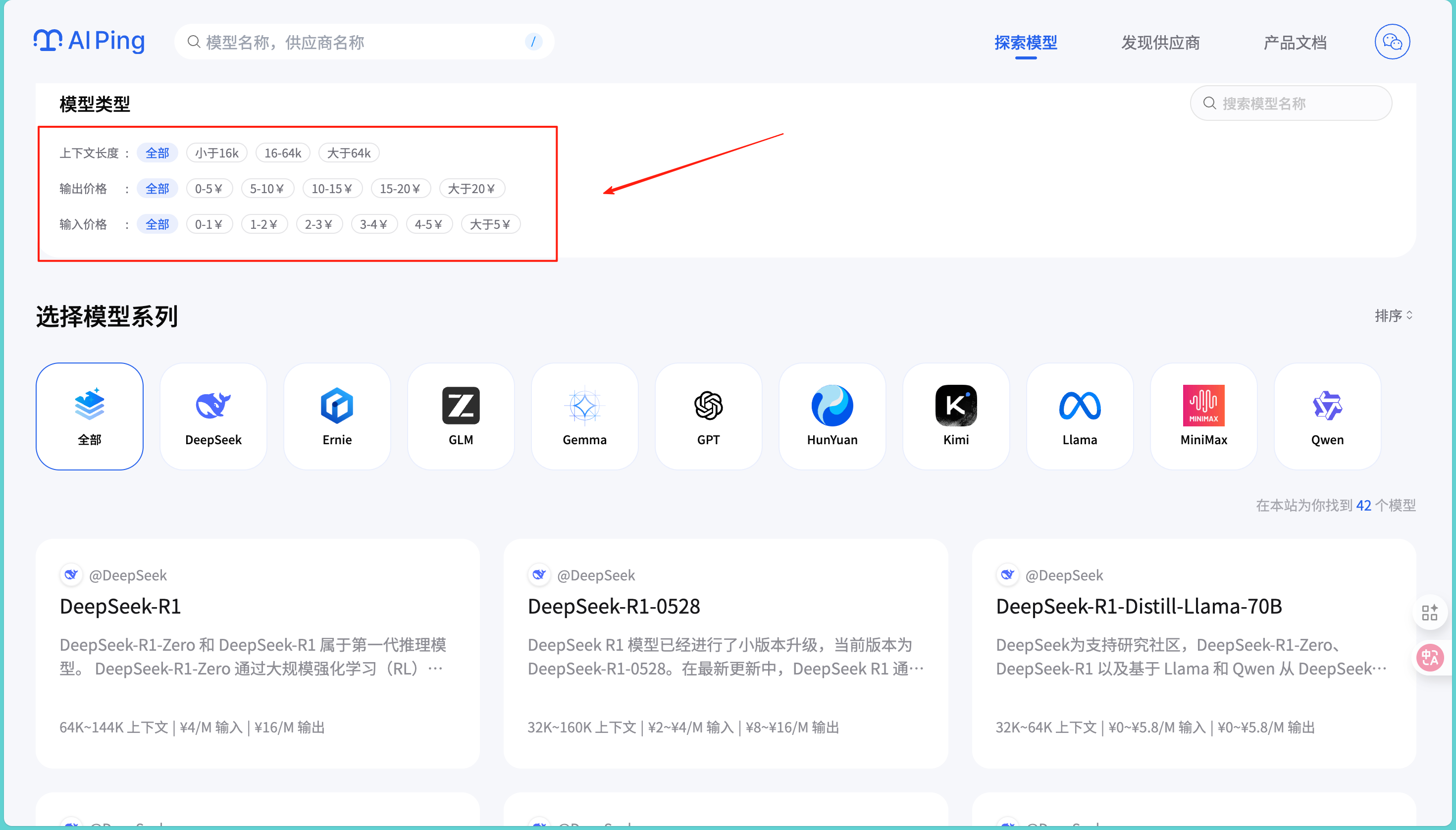 作为一个对模型参数比较敏感的开发者,我特别关注AI Ping的筛选功能。在主页可以按照上下文长度(全部、小于16k、16-64k、大于64k)、输出价格、输入价格等维度进行筛选,这对我这种有明确需求的用户来说非常实用。