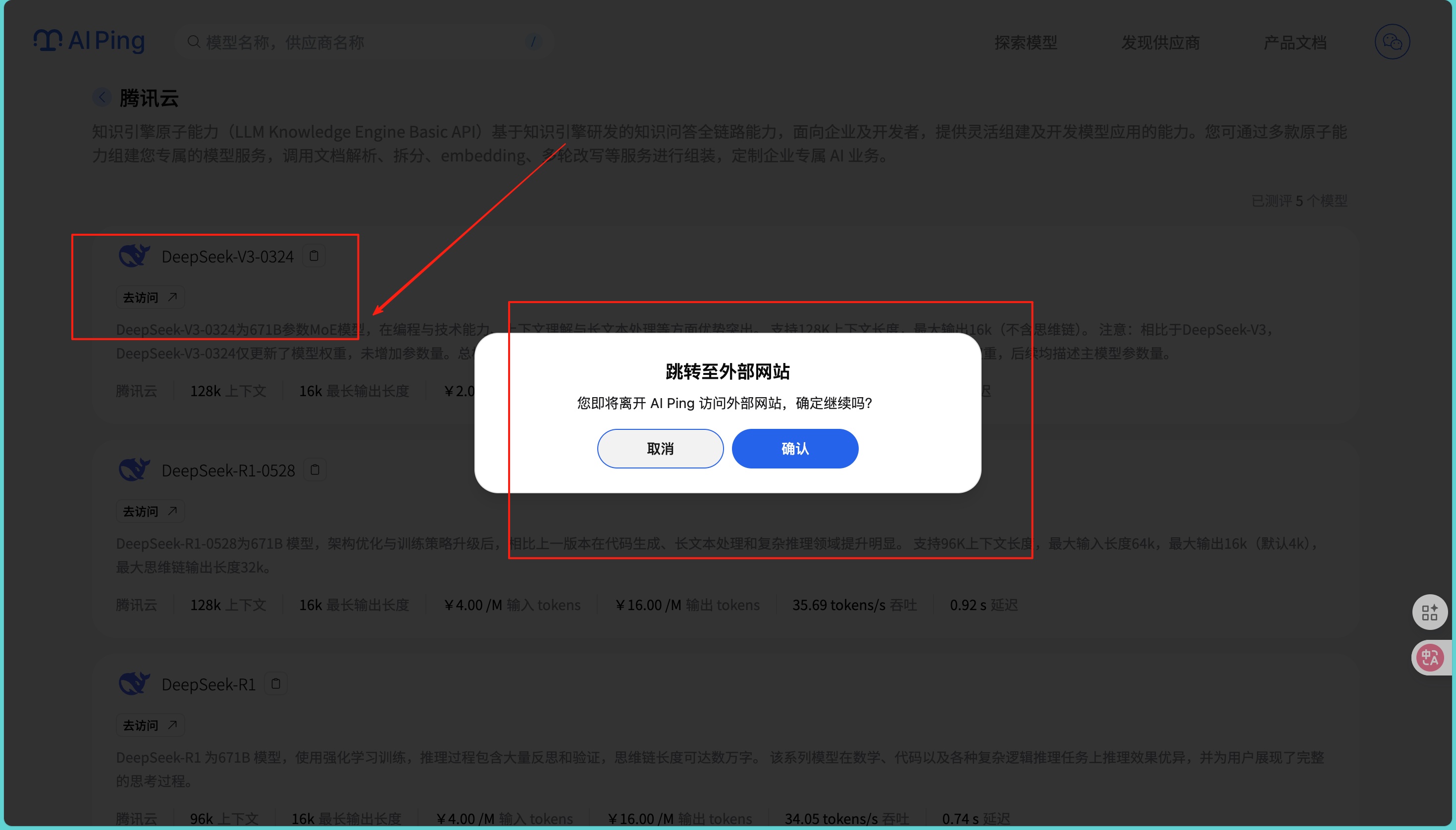 当我想要访问某个模型的官方页面时,系统会弹出确认对话框提醒跳转到外部网站,这个细节体现了产品的用户体验考虑。不过,我觉得如果能在表格中增加一些成本效益的计算指标会更好,比如各个厂家模型的综合性价比评分,这样对于我这种预算有限的开发者会更方便使用。