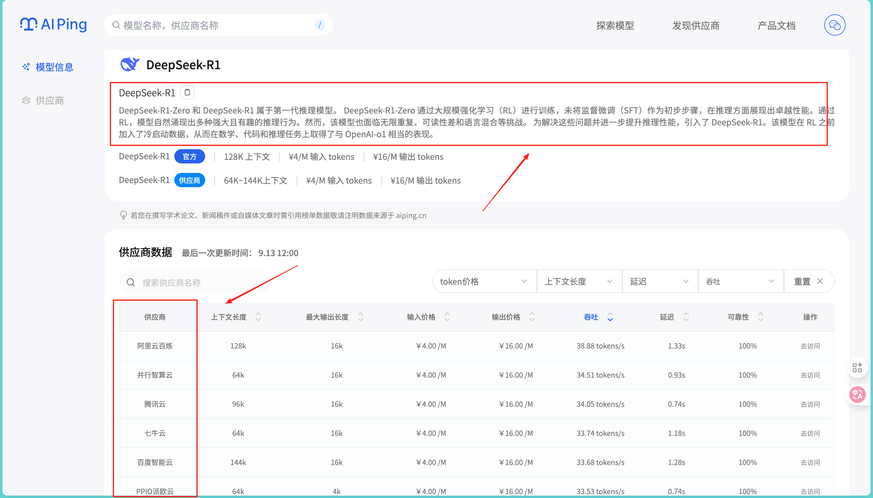 特别值得一提的是模型详情页的设计,以DeepSeek-R1为例,页面上方有详细的模型介绍,包括技术背景和能力特点。下方的供应商数据表格更是亮点:可以看到阿里云、开行智算云、腾讯云、七牛云等各家供应商的具体表现数据。