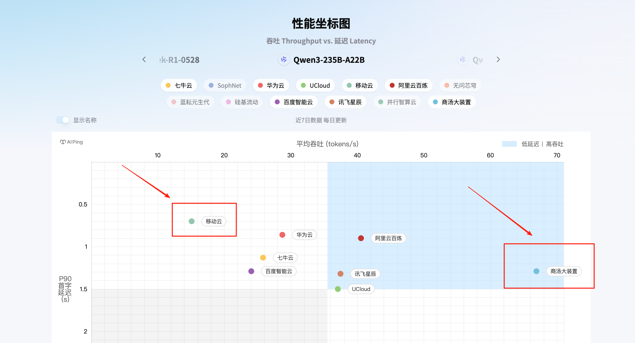 从性能坐标图可以看到,不同供应商在同一个模型上的表现差异还是挺明显的。商汤大装置在吞吐量方面表现突出,而移动云和华为云在延迟控制上各有优势。这种直观的对比让我能快速识别出哪家供应商更适合我的具体需求。