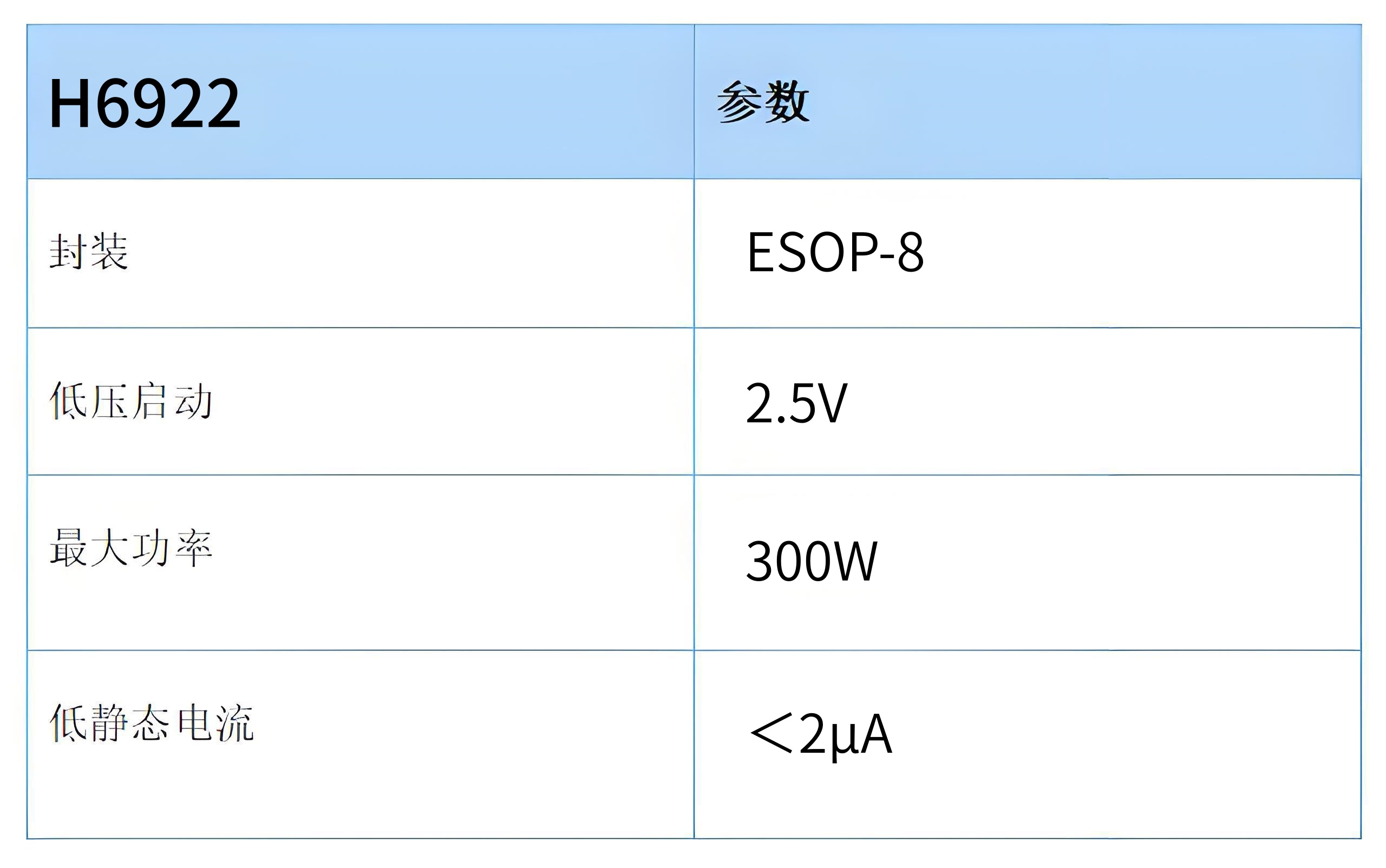 这些参数使得 H6922 具备 2.5V 的低压启动能力,能够在弱光环境下,当电池电压较低时正常工作。同时,其低静态电流和可升高压的扩展能力,确保了在多类户外场景中的稳定供电,无论是小型设备还是较大功率设备,都能得到可靠的电力支持。